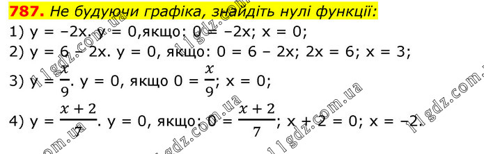 He будуючи графіка, знайдіть нулі функції: 1) y = –2x. y = 0,якщо: 0 = –2х; х = 0; 2) y = 6 – 2х. y = 0, якщо: 0 = 6 – 2x; 2x = 6; х = 3; 3) y = x/9. y = 0, якщо 0 = x/9; х = 0; 4) y = (x + 2)/7. y = 0, якщо: 0 = (x + 2)/7; х + 2 = 0; х = –2.