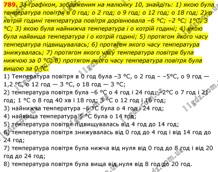 За графіком, зображеним на малюнку 10, знайдіть: 1) якою була температура повітря в 0 год; о 2 год; о 9 год; о 12 год; о 18 год; 2) о котрій годині температура повітря дорівнювала –6 °С; –2 °С; 1°С; З °С; 3) якою була найнижча температура і о котрій годині; 4) якою була найвища температура і о котрій годині; 5) протягом якого часу температура підвищувалась; 6) протягом якого часу температура знижувалась; 7) протягом якого часу температура повітря була нижчою за 0 °С; 8) протягом якого часу температура повітря була вищою за 0 °С. 1) Температура повітря в 0 год була –З °С, о 2 год – –5°С, о 9 год — 1,2 °С, о 12 год — З °С, о 18 год — З °С; 2) температура повітря була –6 °С о 4 год і 24 год; –2°С о 7 год і 21 год; 1 °С о 8 год 40 хв і 18 год; З °С о 12 год і 16 год; 3) найнижча температура –6 °С була о 4 год і 24 год; 4) найвища температура 5 °С була о 14 год; 5) температура повітря підвищувалась від 4 год до 14 год; 6) температура повітря знижувалась від 0 год до 4 год і від 14 год до 24 год; 7) температура повітря була нижча від нуля від 0 год до 8 год і від 20 год до 24 год; 8) температура повітря була вища від нуля від 8 год до 20 год.