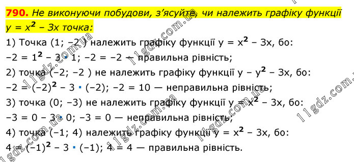 He виконуючи побудови, з’ясуйте, чи належить графіку функції у = x2 – Зх точка: 1) Точка (1; –2 ) належить графіку функції у = x2 – Зх, бо: –2 = 12 – 3 ∙ 1; –2 = –2 — правильна рівність; 2) точка (–2; –2 ) не належить графіку функції у – у2 – Зх, бо: –2 = (–2)2 – 3 ∙ (–2); –2 = 10 — неправильна рівність; 3) точка (0; –3) не належить графіку функції у = x2 – 3х, бо: –3 = 0 – 3 ∙ 0; –3 = 0 — неправильна рівність; 4) точка (–1; 4) належить графіку функції у = х2 – 3х, бо: 4 = (–1)2 – 3 ∙ (–1); 4 = 4 — правильна рівність.