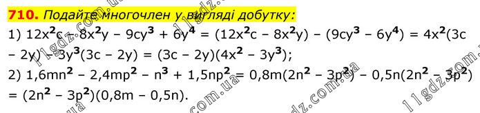 Подайте многочлен у вигляді добутку: 1) 12х2с – 8х2у – 9сy3 + 6y4 = (12х2с – 8х2у) – (9сy3 – 6y4) = 4х2(3с – 2у) – 3y3(3с – 2у) = (Зс – 2у)(4х2 – 3у3); 2) 1,6mn2 – 2,4mp2 – n3 + 1,5nр2 = 0,8m(2n2 – Зр2) – 0,5n(2n2 – Зр2) = (2n2 – Зр2)(0,8m – 0,5n).