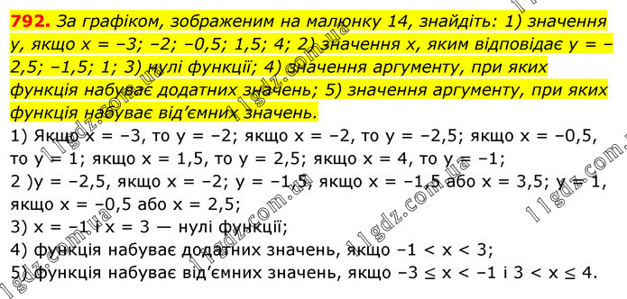 За графіком, зображеним на малюнку 14, знайдіть: 1) значення у, якщо х = –3; –2; –0,5; 1,5; 4; 2) значення х, яким відповідає у = –2,5; –1,5; 1; 3) нулі функції; 4) значення аргументу, при яких функція набуває додатних значень; 5) значення аргументу, при яких функція набуває від’ємних значень. 1) Якщо х = –3, то у = –2; якщо х = –2, то у = –2,5; якщо х = –0,5, то у = 1; якщо х = 1,5, то у = 2,5; якщо х = 4, то у = –1; 2 )у = –2,5, якщо х = –2; у = –1,5, якщо х = –1,5 або х = 3,5; у = 1, якщо х = –0,5 або х = 2,5; 3) х = –1 і х = 3 — нулі функції; 4) функція набуває додатних значень, якщо –1 < х < 3; 5) функція набуває від’ємних значень, якщо –3 ≤ х < –1 і 3 < х ≤ 4.