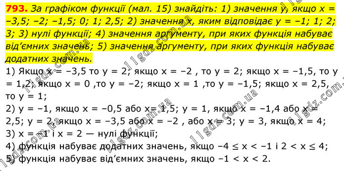 За графіком функції (мал. 15) знайдіть: 1) значення у, якщо х = –3,5; –2; –1,5; 0; 1; 2,5; 2) значення х, яким відповідає у = –1; 1; 2; 3; 3) нулі функції; 4) значення аргументу, при яких функція набуває від’ємних значень; 5) значення аргументу, при яких функція набуває додатних значень. 1) Якщо х = –3,5 то у = 2; якщо х = –2 , то у = 2; якщо х = –1,5, то у = 1,2; якщо х = 0 ,то у = –2; якщо х = 1 ,то у = –1,5; якщо х = 2,5, то у = 1; 2) у = –1, якщо х = –0,5 або х= 1,5; у = 1, якщо х = –1,4 або х = 2,5; у = 2, якщо х = –3,5 або х = –2 , або х = 3; у = 3, якщо х = 4; 3) х = –1 і х = 2 — нулі функції; 4) функція набуває додатних значень, якщо –4 ≤ х < –1 і 2 < х ≤ 4; 5) функція набуває від’ємних значень, якщо –1 < х < 2.