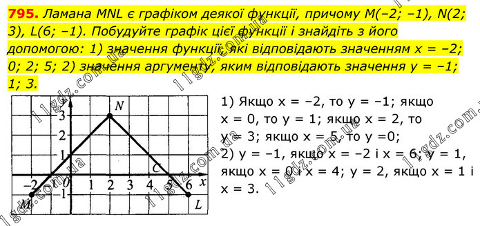 Ламана MNL є графіком деякої функції, причому М(–2; –1), N(2; 3), L(6; –1). Побудуйте графік цієї функції і знайдіть з його допомогою: 1) значення функції, які відповідають значенням х = –2; 0; 2; 5; 2) значення аргументу, яким відповідають значення у = –1; 1; 3. 1) Якщо х = –2, то у = –1; якщо x = 0, то у = 1; якщо х = 2, то у = 3; якщо х = 5, то y =0; 2) у = –1, якщо x = –2 і x = 6; у = 1, якщо x = 0 і x = 4; у = 2, якщо x = 1 і x = 3.