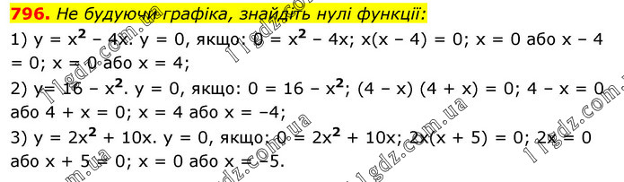 He будуючи графіка, знайдіть нулі функції: 1) у = x2 – 4x. у = 0, якщо: 0 = x2 – 4x; x(x – 4) = 0; x = 0 або x – 4 = 0; x = 0 або х = 4; 2) у= 16 – х2. у = 0, якщо: 0 = 16 – х2; (4 – x) (4 + x) = 0; 4 – x = 0 або 4 + x = 0; x = 4 або х = –4; 3) у = 2х2 + 10х. у = 0, якщо: 0 = 2x2 + 10x; 2x(x + 5) = 0; 2x = 0 або x + 5 = 0; x = 0 або x = –5.