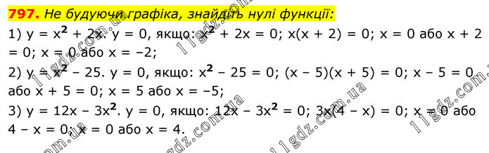 He будуючи графіка, знайдіть нулі функції: 1) у = x2 + 2х. у = 0, якщо: x2 + 2x = 0; x(x + 2) = 0; x = 0 або x + 2 = 0; x = 0 або х = –2; 2) у = x2 – 25. у = 0, якщо: x2 – 25 = 0; (х – 5)(x + 5) = 0; x – 5 = 0 або x + 5 = 0; x = 5 або x = –5; 3) у = 12x – 3x2. у = 0, якщо: 12x – 3x2 = 0; 3x(4 – x) = 0; х = 0 або 4 – х = 0; x = 0 або х = 4.