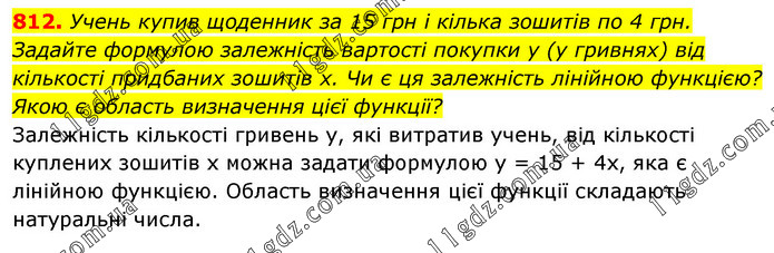 Учень купив щоденник за 15 грн і кілька зошитів по 4 грн. Задайте формулою залежність вартості покупки у (у гривнях) від кількості придбаних зошитів х. Чи є ця залежність лінійною функцією? Якою є область визначення цієї функції? Залежність кількості гривень у, які витратив учень, від кількості куплених зошитів х можна задати формулою у = 15 + 4х, яка є лінійною функцією. Область визначення цієї функції складають натуральні числа.