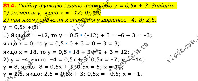 Лінійну функцію задано формулою у = 0,5х + 3. Знайдіть: 1) значення у, якщо х = –12; 0; 18; 2) при якому значенні х значення у дорівнює –4; 8; 2,5. у = 0,5х + 3. 1) Якщо х = –12, то у = 0,5 ∙ (–12) + 3 = –6 + 3 = –3; якщо х = 0, то у = 0,5 ∙ 0 + 3 = 0 + 3 = 3; якщо х = 18, то у = 0,5 ∙ 18 + 3 = 9 + 3 = 12; 2) у = –4, якщо: –4 = 0,5х + 3; 0,5х = –7; х = –14; у = 8, якщо: 8 = 0,5х + 3; 0,5х = 5; х = 10; у = 2,5, якщо: 2,5 = 0,5х + 3; 0,5х = –0,5; х = –1.