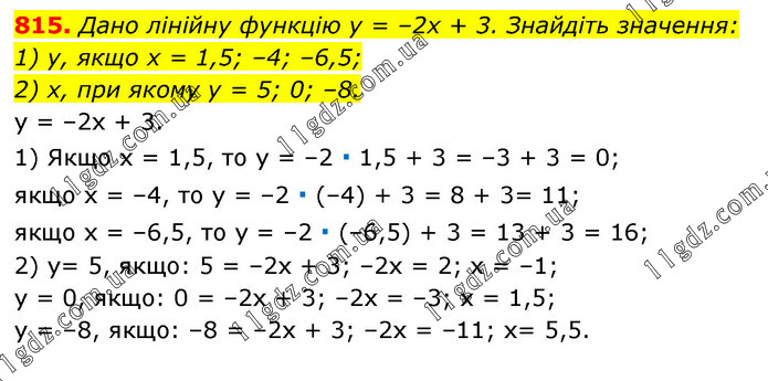 Дано лінійну функцію у = –2х + 3. Знайдіть значення: 1) у, якщо х = 1,5; –4; –6,5; 2) х, при якому у = 5; 0; –8. у = –2х + 3. 1) Якщо х = 1,5, то у = –2 ∙ 1,5 + 3 = –3 + 3 = 0; якщо х = –4, то у = –2 ∙ (–4) + 3 = 8 + 3= 11; якщо х = –6,5, то у = –2 ∙ (–6,5) + 3 = 13 + 3 = 16; 2) у= 5, якщо: 5 = –2х + 3; –2х = 2; х = –1; у = 0, якщо: 0 = –2х + 3; –2х = –3; х = 1,5; у = –8, якщо: –8 = –2х + 3; –2х = –11; х= 5,5.