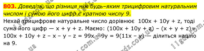 Доведіть, що різниця між будь–яким трицифровим натуральним числом і сумою його цифр є кратною числу 9. Нехай трицифрове натуральне число дорівнює 100x + 10y + z, тоді сума його цифр — x + y + z. Маємо: (100x + 10y + z) – (x + y + z)= 100x + 10y + z – x – y – z = 99х – 9у = 9(11x – у) — ділиться націло на 9.