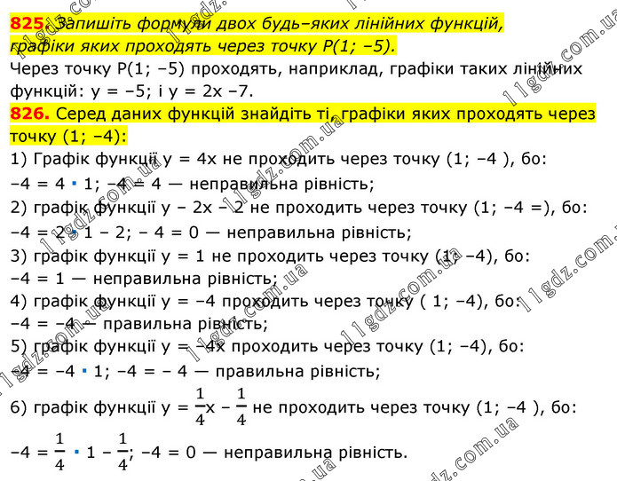 825. Запишіть формули двох будь–яких лінійних функцій, графіки яких проходять через точку Р(1; –5). Через точку Р(1; –5) проходять, наприклад, графіки таких лінійних функцій: у = –5; i у = 2х –7. 826. Серед даних функцій знайдіть ті, графіки яких проходять через точку (1; –4): 1) Графік функції у = 4x не проходить через точку (1; –4 ), бо: –4 = 4 ∙ 1; –4 = 4 — неправильна рівність; 2) графік функції y – 2x – 2 не проходить через точку (1; –4 =), бо: –4 = 2 ∙ 1 – 2; – 4 = 0 — неправильна рівність; 3) графік функції у = 1 не проходить через точку (1; –4), бо: –4 = 1 — неправильна рівність; 4) графік функції у = –4 проходить через точку ( 1; –4), бо: –4 = –4 — правильна рівність; 5) графік функції у = –4x проходить через точку (1; –4), бо: –4 = –4 ∙ 1; –4 = – 4 — правильна рівність; 6) графік функції у = 1/4x – 1/4 не проходить через точку (1; –4 ), бо: –4 = 1/4 ∙ 1 – 1/4; –4 = 0 — неправильна рівність.