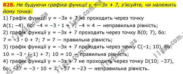 He будуючи графіка функції у = –Зх + 7, з’ясуйте, чи належить йому точка: 1) Графік функції у = –Зх + 7 не проходить через точку А(1; –4), бо: –4 = –3 ∙ 1 + 7; –4 = 4 — неправильна рівність; 2) графік функції у = –Зх + 7 проходить через точку B(0; 7), бо: 7 = –3 ∙ 0 + 7; 7 = 7 — правильна рівність; 3) графік функції у = –Зх + 7 проходить через точку С(–1; 10), бо: 10 = –3 ∙ (–1) + 7; 10 = 10 — правильна рівність; 4) графік функції y = –Зх + 7 не проходить через точку D(10; –37), бо: –37 = –3 ∙ 10 + 7; –37 = –23 — неправильна рівність.