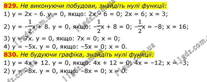 829. He виконуючи побудови, знайдіть нулі функції: 1) у = 2х – 6. у = 0, якщо: 2x – 6 = 0; 2х = 6; х = 3; 2) y = –1/2x + 8. y = 0, якщо: –1/2x + 8 = 0; –1/2х = –8; х = 16; 3) у = 7х. у = 0, якщо: 7х = 0; х = 0; 4) у = –5х. у = 0, якщо: –5х = 0; х = 0. 830. He будуючи графіка, знайдіть нулі функції: 1) у = 4х + 12. у = 0, якщо: 4х + 12 = 0; 4х = –12; х = –3; 2) у = –8х. у = 0, якщо: –8х = 0; х = 0.