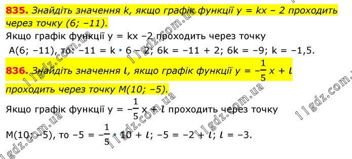 835. Знайдіть значення k, якщо графік функції у = kx – 2 проходить через точку (6; –11). Якщо графік функції у = kх –2 проходить через точку А(6; –11), то: –11 = k ∙ 6 – 2; 6k = –11 + 2; 6k = –9; k = –1,5. 836. Знайдіть значення ι, якщо графік функції у = –1/5 x + ι проходить через точку М(10; –5). Якщо графік функції у = –1/5 x + ι проходить через точку М(10; –5), то –5 = –1/5 ∙ 10 + ι; –5 = –2 + ι; ι = –3.
