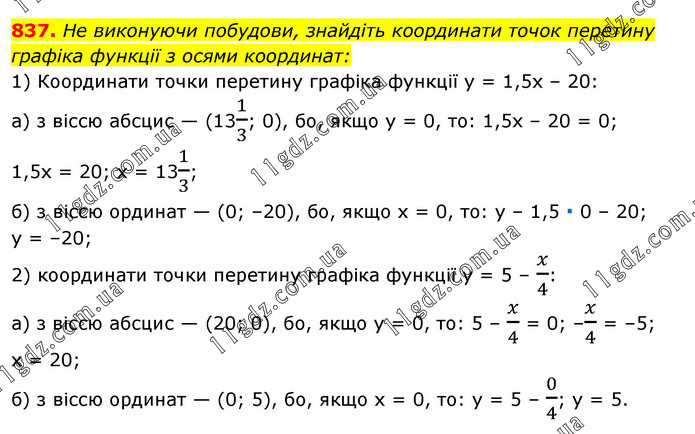 He виконуючи побудови, знайдіть координати точок перетину графіка функції з осями координат: 1) Координати точки перетину графіка функції у = 1,5х – 20: а) з віссю абсцис — (131/3; 0), бо, якщо у = 0, то: 1,5x – 20 = 0; 1,5x = 20; х = 131/3; б) з віссю ординат — (0; –20), бо, якщо х = 0, то: у – 1,5 ∙ 0 – 20; у = –20; 2) координати точки перетину графіка функції у = 5 – x/4: а) з віссю абсцис — (20; 0), бо, якщо у = 0, то: 5 – x/4 = 0; –x/4 = –5; х = 20; б) з віссю ординат — (0; 5), бо, якщо х = 0, то: у = 5 – 0/4; y = 5.
