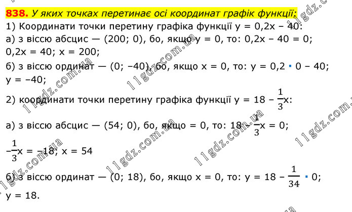 У яких точках перетинає осі координат графік функції: 1) Координати точки перетину графіка функції у = 0,2х – 40: а) з віссю абсцис — (200; 0), бо, якщо у = 0, то: 0,2x – 40 = 0; 0,2х = 40; x = 200; б) з віссю ординат — (0; –40), бо, якщо х = 0, то: у = 0,2 ∙ 0 – 40; у = –40; 2) координати точки перетину графіка функції у = 18 – 1/3x: а) з віссю абсцис — (54; 0), бо, якщо = 0, то: 18 – 1/3х = 0; –1/3х = –18; х = 54 б) з віссю ординат — (0; 18), бо, якщо x = 0, то: у = 18 – 1/34 ∙ 0; y = 18.