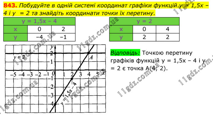 Побудуйте в одній системі координат графіки функцій y = 1,5х –4 і y = 2 та знайдіть координати точки їх перетину.