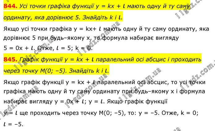 844. Усі точки графіка функції у = kx + ι мають одну й ту саму ординату, яка дорівнює 5. Знайдіть k і ι. Якщо усі точки графіка у = kх+ ι мають одну й ту саму ординату, яка дорівнює 5 при будь–якому х, то формула набирає вигляду 5 = 0x + ι. Отже, ι = 5; k = 0. 845. Графік функції у = kx + ι паралельний осі абсцис і проходить через точку М(0; –5). Знайдіть k і ι. Якщо графік функції у = kх + ι паралельний осі абсцис, то усі точки графіка мають одну й ту саму ординату при будь–якому х і формула набирає вигляду у = 0x + ι; у = ι. Якщо графік функції у = ι ще проходить через точку M(0; –5), то: у = –5. Отже, k = 0; ι = –5.