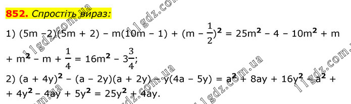Спростіть вираз: 1) (5m –2)(5m + 2) – m(10m – 1) + (m – 1/2)2 = 25m2 – 4 – 10m2 + m + m2 – m + 1/4 = 16m2 – 33/4; 2) (a + 4y)2 – (a – 2y)(a + 2y) – y(4a – 5y) = a2 + 8ay + 16у2 – a2 + + 4y2 – 4ay + 5y2 = 25y2 + 4ay.