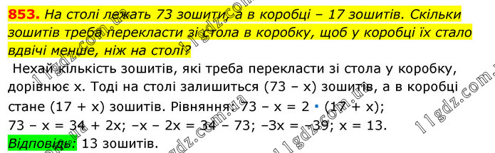 Ha столі лежать 73 зошити, а в коробці – 17 зошитів. Скільки зошитів треба перекласти зі стола в коробку, щоб у коробці їх стало вдвічі менше, ніж на столі? Нехай кількість зошитів, які треба перекласти зі стола у коробку, дорівнює x. Тоді на столі залишиться (73 – х) зошитів, а в коробці стане (17 + х) зошитів. Рівняння: 73 – х = 2 ∙ (17 + х); 73 – х = 34 + 2х; –х – 2х = 34 – 73; –Зх = –39; х = 13. Відповідь: 13 зошитів.