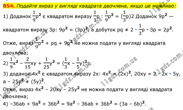 Подайте вираз у вигляді квадрата двочлена, якщо це можливо: 1) Доданок 1/9p2 є квадратом виразу 1/3p : 1/9p2 = (1/3p)2 Доданок 9р2 — квадратом виразу Зр: 9р2 = (Зр)2, а добуток pq ≠ 2 ∙ 1/3p ∙ Зр = 2р2. Отже, вираз 1/9p2 + pq + 9p2 не можна подати у вигляді квадрата двочлена; 2) 1/9x2 – 2/15xy + 1/25y2 = (1/3x – 1/5y)2; 3) доданок 4х2 є квадратом виразу 2х: 4х2 = (2х)2, 20ху = 2 ∙ 2х ∙ 5y, a – 25y2 ≠ (5y)2. Отже, вираз 4х2 – 20ху – 25у2 не можна подати у вигляді квадрата двочлена; 4) –36ab + 9a2 + 36b2 = 9а2 – З6аb + 36b2 = (3а – 6b)2.