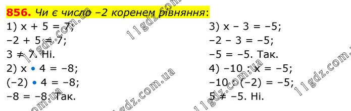 Чи є число –2 коренем рівняння: 1) х + 5 = 7; –2 + 5 = 7; 3 ≠ 7. Ні. 2) х • 4 = –8; (–2) • 4 = –8; –8 = –8. Так. 3) х – 3 = –5; –2 – 3 = –5; –5 = –5. Так. 4) –10 : х = –5; –10 : (–2) = –5; 5 ≠ –5. Ні.