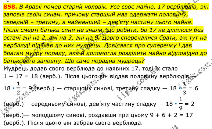 В Аравії помер старий чоловік. Усе своє майно, 17 верблюдів, він заповів своїм синам, причому старший мав одержати половину, середній – третину, а найменший – дев’яту частину цього майна. Після смерті батька сини не знали, що робити, бо 17 не ділилося без остачі ані на 2, ані на 3, ані на 9. Довго сперечалися брати, аж тут на верблюді під’їхав до них мудрець. Довідався про суперечку і дав братам мудру пораду, яка й допомогла розділити майно відповідно до батькового заповіту. Що саме порадив мудрець? Мудрець додав свого верблюда до наявних 17, тоді їх стало 1 + 17 = 18 (верб.). Після цього він віддав половину верблюдів — 18 ∙ 1/2 = 9 (верб.) — старшому синові, третину спадку — 18 ∙ 1/3 = 6 (верб.)— середньому синові, дев’яту частину спадку — 18 ∙ 1/9 = 2 (верб.)— молодшому синові, роздавши при цьому 9 + 6 + 2 = 17 (верб.). Після цього він забрав свого верблюда.