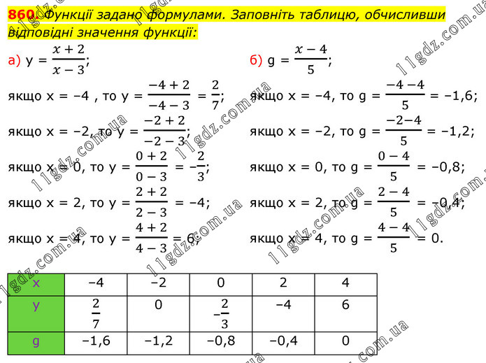 Функції задано формулами. Заповніть таблицю, обчисливши відповідні значення функції: a) у = (x + 2)/(x - 3); якщо х = –4 , то у = (-4 + 2)/(-4 - 3) = 2/7; якщо х = –2, то y = (-2 + 2)/(-2 - 3); якщо х = 0, то у = (0 + 2)/(0 - 3) = –2/3; якщо х = 2, то у = (2 + 2)/(2 - 3) = –4; якщо х = 4, то у = (4 + 2)/(4 - 3) = 6; б) g = (x - 4)/5; якщо х = –4, то g = (-4 -4)/5 = –1,6; якщо х = –2, то g = (-2-4)/5 = –1,2; якщо х = 0, то g = (0 - 4)/5 = –0,8; якщо х = 2, то g = (2 - 4)/5 = –0,4; якщо х = 4, то g = (4 - 4)/5 = 0.