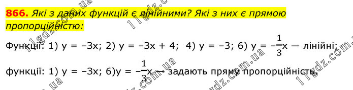 Які з даних функцій є лінійними? Які з них є прямою пропорційністю: Функції: 1) у = –Зх; 2) у = –Зх + 4; 4) у = –3; 6) у = –1/3х — лінійні; функції: 1) у = –Зх; 6)у = –1/3х — задають пряму пропорційність.