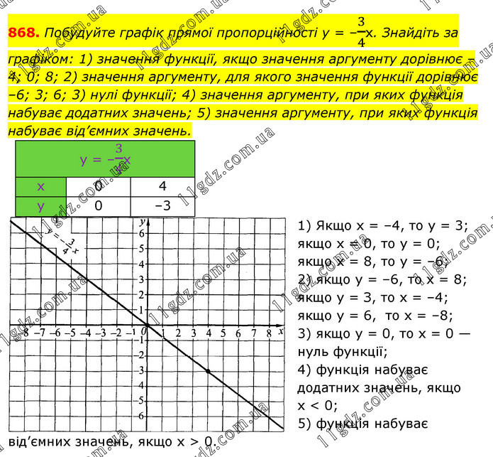 Побудуйте графік прямої пропорційності у = –3/4x. Знайдіть за графіком: 1) значення функції, якщо значення аргументу дорівнює –4; 0; 8; 2) значення аргументу, для якого значення функції дорівнює –6; 3; 6; 3) нулі функції; 4) значення аргументу, при яких функція набуває додатних значень; 5) значення аргументу, при яких функція набуває від’ємних значень. 1) Якщо х = –4, то у = 3; якщо х = 0, то у = 0; якщо х = 8, то у = –6; 2) якщо у = –6, то x = 8; якщо у = З, то х = –4; якщо у = 6, то х = –8; 3) якщо у = 0, то х = 0 — нуль функції; 4) функція набуває додатних значень, якщо х < 0; 5) функція набуває від’ємних значень, якщо х > 0.