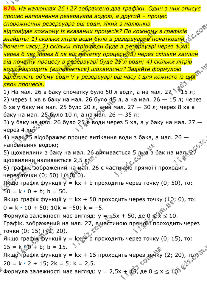 На малюнках 26 і 27 зображено два графіки. Один з них описує процес наповнення резервуара водою, а другий – процес спорожнення резервуара від води. Який з малюнків відповідає кожному із вказаних процесів? По кожному з графіків знайдіть: 1) скільки літрів води було в резервуарі в початковий момент часу; 2) скільки літрів води буде в резервуарі через 1 хв; через 6 хв; через 8 хв від початку процесу; 3) через скільки хвилин від початку процесу в резервуарі буде 25 л води; 4) скільки літрів води надходить (виливається) щохвилини? Задайте формулою залежність об’єму води V у резервуарі від часу t для кожного із цих двох процесів. 1) На мал. 26 в баку спочатку було 50 л води, а на мал. 27 — 15 л; 2) через 1 хв в баку на мал. 26 було 45 л, а на мал. 26 — 15 л; через 6 хв у баку на мал. 25 було 20 л, а на мал. 27 — 30 л; через 8 хв в баку на мал. 25 було 10 л, а на мал. 26 — 35 л; 3) у баку на мал. 26 було 25 л води через 5 хв, а у баку на мал. 27 — через 4 хв; 4) мал. 25 відображає процес витікання води з бака, а мал. 26 — наповнення водою; 5) щохвилини з баку на мал. 26 виливається 5 л, а в бак на мал. 27 щохвилини наливається 2,5 л; 6) графік, зображений на мал. 26 є частиною прямої і проходить через точки (0; 50) і (10; 0). Якщо графік функції у = kx + b проходить через точку (0; 50), то: 50 = k ∙ 0 + b; b = 50. Якщо графік функції у = kх + 50 проходить через точку (10; 0), то: 0 = k ∙ 10 + 50; 10k = –50; k = –5. Формула залежності має вигляд: у = –5х + 50, де 0 ≤ х ≤ 10. Графік, зображений на мал. 27, є частиною прямої і проходить через точки (0; 15) і (2; 20). Якщо графік функції у = kx + b проходить через точку (0; 15), то: 15 = k ∙ 0 + b; b = 15. Якщо графік функції у = kх + 15 проходить через точку (2; 20), то: 20 = k ∙ 2 + 15; 2k = 5; k = 2,5. Формула залежності має вигляд: у = 2,5х + 15, де 0 ≤ х ≤ 10.