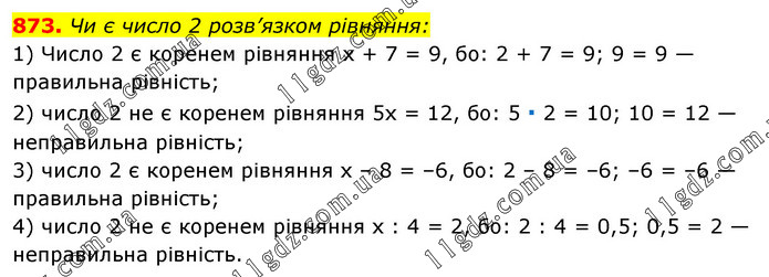 Чи є число 2 розв’язком рівняння: 1) Число 2 є коренем рівняння х + 7 = 9, бо: 2 + 7 = 9; 9 = 9 — правильна рівність; 2) число 2 не є коренем рівняння 5х = 12, бо: 5 ∙ 2 = 10; 10 = 12 — неправильна рівність; 3) число 2 є коренем рівняння х – 8 = –6, бо: 2 – 8 = –6; –6 = –6 — правильна рівність; 4) число 2 не є коренем рівняння х : 4 = 2, бо: 2 : 4 = 0,5; 0,5 = 2 — неправильна рівність.