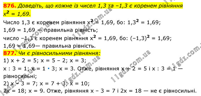 876. Доведіть, що кожне із чисел 1,3 та –1,3 є коренем рівняння x2 = 1,69. Число 1,3 є коренем рівняння х2 = 1,69, бо: 1,32 = 1,69; 1,69 = 1,69 — правильна рівність; число –1,3 є коренем рівняння x2 = 1,69, бо: (–1,3)2 = 1,69; 1,69 = 1,69— правильна рівність. 877. Чи є рівносильними рівняння: 1) х + 2 = 5; х = 5 – 2; х = 3; х : 3 = 1; х = 1 ∙ 3; х = 3. Отже, рівняння х + 2 = 5 і х : 3 = 1 — рівносильні; 2) х – 3 = 7; х = 7 + 3; х = 10; 2х = 18; х = 9. Отже, рівняння х – 3 = 7 і 2х = 18 — не є рівносильні.