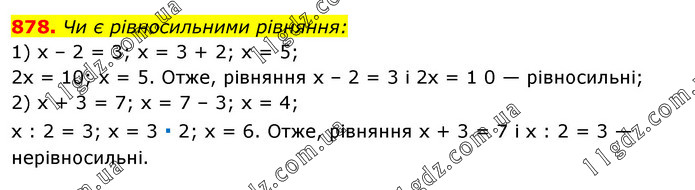 Чи є рівносильними рівняння: 1) х – 2 = 3; х = 3 + 2; х = 5; 2х = 10; х = 5. Отже, рівняння х – 2 = 3 і 2х = 1 0 — рівносильні; 2) x + 3 = 7; х = 7 – 3; х = 4; х : 2 = 3; х = 3 ∙ 2; х = 6. Отже, рівняння х + 3 = 7 і х : 2 = 3 — нерівносильні.
