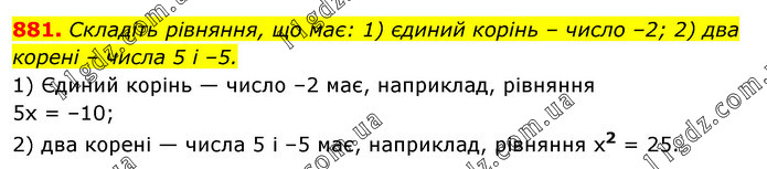 Складіть рівняння, що має: 1) єдиний корінь – число –2; 2) два корені – числа 5 і –5. 1) Єдиний корінь — число –2 має, наприклад, рівняння 5х = –10; 2) два корені — числа 5 і –5 має, наприклад, рівняння х2 = 25.