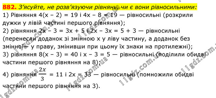 З’ясуйте, не розв’язуючи рівнянь, чи є вони рівносильними: 1) Рівняння 4(х – 2) = 19 і 4х – 8 = 19 — рівносильні (розкрили дужки у лівій частині першого рівняння); 2) рівняння 2x – 3 = 3x + 5 і 2х – 3х = 5 + 3 — рівносильні (перенесли доданок зі змінною х у ліву частину, а доданок без змінної— у праву, змінивши при цьому їх знаки на протилежні); 3) рівняння 8(х – 3) = 40 і х – 3 = 5 — рівносильні (поділили обидві частини першого рівняння на 8); 4) рівняння 2x/3 = 11 і 2х = 33 — рівносильні (помножили обидві частини першого рівняння на 3).