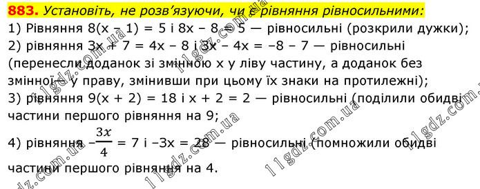 Установіть, не розв’язуючи, чи є рівняння рівносильними: 1) Рівняння 8(х – 1) = 5 і 8х – 8 = 5 — рівносильні (розкрили дужки); 2) рівняння Зх + 7 = 4х – 8 і Зх – 4х = –8 – 7 — рівносильні (перенесли доданок зі змінною х у ліву частину, а доданок без змінної— у праву, змінивши при цьому їх знаки на протилежні); 3) рівняння 9(х + 2) = 18 і х + 2 = 2 — рівносильні (поділили обидві частини першого рівняння на 9; 4) рівняння –3x/4 = 7 і –Зх = 28 — рівносильні (помножили обидві частини першого рівняння на 4.