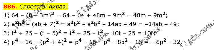 Спростіть вираз: 1) 64 – (8 – 3m)2 = 64 – 64 + 48m – 9m2 = 48m – 9m2; 2) a2b2 – (аb + 7)2 = a2b2 – a2b2 – 14ab – 49 = –14аb – 49; 3) t2 + 25 – (t – 5)2 = t2 + 25 – t2 + 10t – 25 = 10t; 4) p4 – 16 – (p2 + 4)2 = p4 – 16 – p4 – 8p2 – 16 = – 8p2 – 32.
