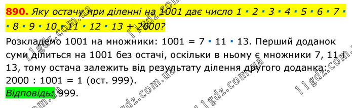 Яку остачу при діленні на 1001 дає число 1 ∙ 2 ∙ 3 ∙ 4 ∙ 5 ∙ 6 ∙ 7 ∙ ∙ 8 ∙ 9 ∙ 10 ∙ 11 ∙ 12 ∙ 13 + 2000? Розкладемо 1001 на множники: 1001 = 7 ∙ 11 ∙ 13. Перший доданок суми ділиться на 1001 без остачі, оскільки в ньому є множники 7, 11 і 13, тому остача залежить від результату ділення другого доданка: 2000 : 1001 = 1 (ост. 999). Відповідь: 999.