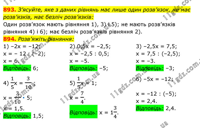 893. З’ясуйте, яке з даних рівнянь має лише один розв’язок, не має розв’язків, має безліч розв’язків: Один розв’язок мають рівняння 1), 3) і 5); не мають розв’язків рівняння 4) і 6); має безліч розв’язків рівняння 2). 894. Розв’яжіть рівняння: 1) –2х = –12; х = – 12 : (–2); х = 6. Відповідь: 6; 2) 0,5х = –2,5; х = –2,5 : 0,5; х = –5. Відповідь: –5; 3) –2,5х = 7,5; х = 7,5 : (–2,5); х = –3. Відповідь: –3; 4) 1/5х = 3/10 ; х = 3/10 ∙ 5; х = 1,5. Відповідь: 1,5; 5) 1/5х = 1; х = 7/4. Відповідь: х = 13/4. 6) –5х = –12; х = –12 : (–5); х = 2,4. Відповідь: 2,4.