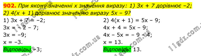 При якому значенні х значення виразу: 1) Зх + 7 дорівнює –2; 2) 4(х + 1) дорівнює значенню виразу 5х – 9? 1) Зх + 7 = –2; Зх = – 2 – 7; Зх = –9; х = –З. Відповідь: –3; 2) 4(х + 1) = 5х – 9; 4х + 4 = 5х – 9; 4х – 5х = – 9 – 4; х = 13. Відповідь: 13.