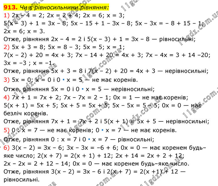 Чи є рівносильними рівняння: 1) 2х – 4 = 2; 2х = 2 + 4; 2х = 6; х = 3; 5(х – 3) + 1 = 3x – 8; 5x – 15 + 1 – Зx – 8; 5x – 3x = – 8 + 15 – 1; 2х = 6; х = 3. Отже, рівняння 2х – 4 = 2 і 5(x – 3) + 1 = Зx – 8 — рівносильні; 2) 5x + 3 = 8; 5x = 8 – 3; 5х = 5; х = 1; 7(х – 2) + 20 = 4х + 3; 7х – 14 + 20 = 4х + 3; 7х – 4х = 3 + 14 –20; 3х = –3 ; х = –1. Отже, рівняння 5х + 3 = 8 і 7(х – 2) + 20 = 4х + 3 — нерівносильні; 3) 5х = 0; х = 0 і 0 ∙ х = 5 — не має коренів. Отже, рівняння 5х = 0 і 0 ∙ х = 5 — нерівносильні; 4) 7х + 1 = 7х + 2; 7х – 7х = 2 – 1; 0x = 1 — не має коренів; 5(х + 1) = 5х + 5; 5х + 5 = 5х + 5; 5х – 5х = 5 – 5; 0x = 0 — має безліч коренів. Отже, рівняння 7х + 1 = 7х + 2 і 5(х + 1) = 5х + 5 — нерівносильні; 5) 0 : х = 7 — не має коренів; 0 ∙ х = 7 — не має коренів. Отже, рівняння 0 : х = 7 і 0 ∙ х = 7 — рівносильні; 6) 3(х – 2) = Зх – 6; 3х – 3х = –6 + 6; 0х = 0 — має коренем будь–яке число; 2(х + 7) = 2(х + 1) + 12; 2х + 14 = 2х + 2 + 12; 2х – 2х = 2 + 12 – 14; 0х = 0 — має коренем будь–яке число. Отже, рівняння 3(х – 2) = Зх – 6 і 2(х + 7) = 2(х +1) + 12 — рівносильні.