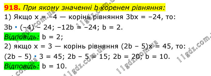 При якому значенні b коренем рівняння: 1) Якщо х = –4 — корінь рівняння 3bх = –24, то: Зb ∙ (–4) – 24; –12b = –24; b = 2. Відповідь: b = 2; 2) якщо х = 3 — корінь рівняння (2b – 5)х = 45, то: (2b – 5) ∙ 3 = 45; 2b – 5 = 15; 2b = 20; b = 10. Відповідь: b = 10.