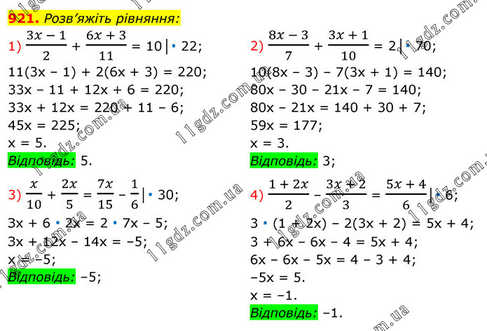 Розв’яжіть рівняння: 1) (3x - 1)/2 + (6x + 3)/11 = 10│∙ 22; 11(3x – 1) + 2(6х + 3) = 220; 33х – 11 + 12х + 6 = 220; 33х + 12х = 220 + 11 – 6; 45x = 225; х = 5. Відповідь: 5. 2) (8x - 3)/7 + (3x + 1)/10 = 2│∙ 70; 10(8х – 3) – 7(3x + 1) = 140; 80х – 30 – 21x – 7 = 140; 80x – 21x = 140 + 30 + 7; 59x = 177; x = 3. Відповідь: 3; 3) x/10 + 2x/5 = 7x/15 – 1/6│∙ 30; Зх + 6 ∙ 2x = 2 ∙ 7х – 5; Зх + 12x – 14х = –5; х = –5; Відповідь: –5; 4) (1 + 2x)/2 – (3x + 2)/3 = (5x + 4)/6│∙ 6; 3 ∙ (1 + 2х) – 2(3х + 2) = 5х + 4; 3 + 6х – 6х – 4 = 5x + 4; 6х – 6х – 5х = 4 – 3 + 4; –5x = 5. х = –1. Відповідь: –1.