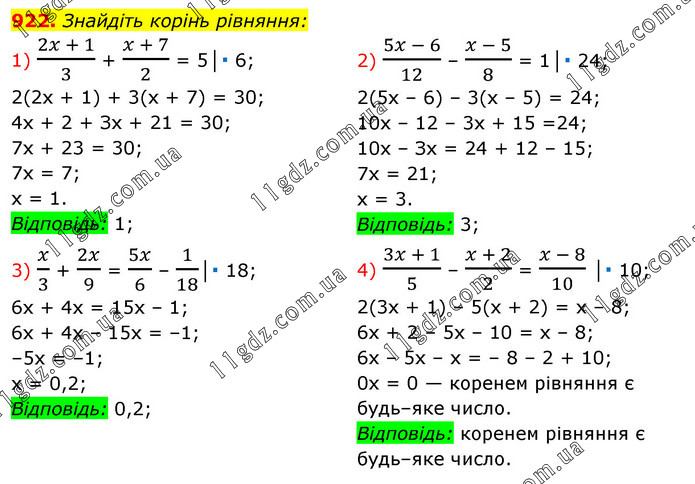 Знайдіть корінь рівняння: 1) (2x + 1)/3 + (x + 7)/2 = 5│∙ 6; 2(2х + 1) + 3(х + 7) = 30; 4х + 2 + Зх + 21 = 30; 7х + 23 = 30; 7х = 7; х = 1. Відповідь: 1; 2) (5x - 6)/12 – (x - 5)/8 = 1│∙ 24; 2(5х – 6) – 3(х – 5) = 24; 10x – 12 – 3x + 15 =24; 10x – Зх = 24 + 12 – 15; 7х = 21; х = 3. Відповідь: 3; 3) x/3 + 2x/9 = 5x/6 – 1/18│∙ 18; 6х + 4х = 15х – 1; 6х + 4х – 15х = –1; –5х = –1; х = 0,2; Відповідь: 0,2; 4) (3x + 1)/5 – (x + 2)/2 = (x - 8)/10 │∙ 10; 2(3х + 1) – 5(х + 2) = х – 8; 6х + 2 – 5х – 10 = х – 8; 6х – 5х – х = – 8 – 2 + 10; 0x = 0 — коренем рівняння є будь–яке число. Відповідь: коренем рівняння є будь–яке число.
