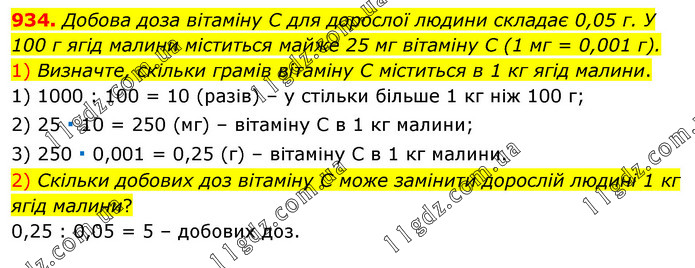 Добова доза вітаміну C для дорослої людини складає 0,05 г. У 100 г ягід малини міститься майже 25 мг вітаміну C (1 мг = 0,001 г). 1) Визначте, скільки грамів вітаміну C міститься в 1 кг ягід малини. 1) 1000 : 100 = 10 (разів) – у стільки більше 1 кг ніж 100 г; 2) 25 ∙ 10 = 250 (мг) – вітаміну С в 1 кг малини; 3) 250 ∙ 0,001 = 0,25 (г) – вітаміну С в 1 кг малини. 2) Скільки добових доз вітаміну C може замінити дорослій людині 1 кг ягід малини? 0,25 : 0,05 = 5 – добових доз.