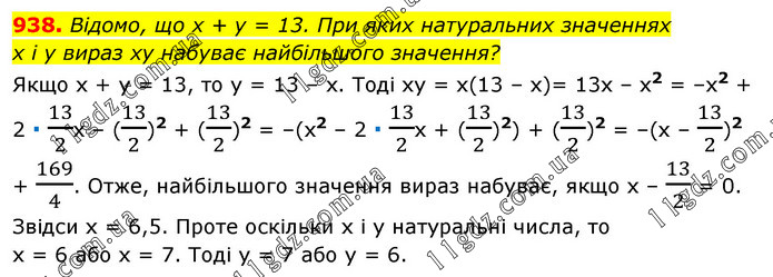 Відомо, що х + у = 13. При яких натуральних значеннях х і у вираз ху набуває найбільшого значення? Якщо х + у = 13, тo y = 13 – х. Тоді ху = х(13 – х)= 13x – x2 = –x2 + 2 ∙ 13/2x – (13/2)2 + (13/2)2 = –(x2 – 2 ∙ 13/2x + (13/2)2) + (13/2)2 = –(x – 13/2)2 + 169/4. Отже, найбільшого значення вираз набуває, якщо х – 13/2 = 0. Звідси х = 6,5. Проте оскільки х і у натуральні числа, то х = 6 або х = 7. Тоді у = 7 або у = 6.