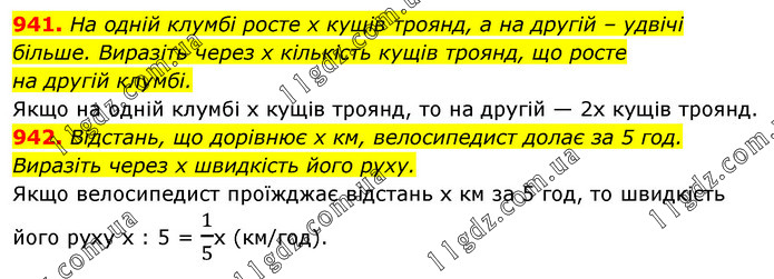 941. На одній клумбі росте х кущів троянд, а на другій – удвічі більше. Виразіть через х кількість кущів троянд, що росте на другій клумбі. Якщо на одній клумбі x кущів троянд, то на другій — 2x кущів троянд. 942. Відстань, що дорівнює х км, велосипедист долає за 5 год. Виразіть через х швидкість його руху. Якщо велосипедист проїжджає відстань x км за 5 год, то швидкість його руху х : 5 = 1/5x (км/год).