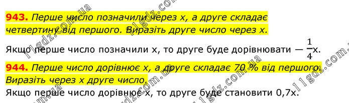 943. Перше число позначили через х, а друге складає четвертину від першого. Виразіть друге число через х. Якщо перше число позначили x, то друге буде дорівнювати — 1/4х. 944. Перше число дорівнює х, а друге складає 70 % від першого. Виразіть через х друге число. Якщо перше число дорівнює х, то друге буде становити 0,7х.