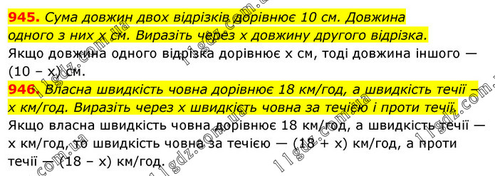 945. Сума довжин двох відрізків дорівнює 10 см. Довжина одного з них х см. Виразіть через х довжину другого відрізка. Якщо довжина одного відрізка дорівнює х см, тоді довжина іншого — (10 – х) см. 946. Власна швидкість човна дорівнює 18 км/год, а швидкість течії – х км/год. Виразіть через х швидкість човна за течією і проти течії. Якщо власна швидкість човна дорівнює 18 км/год, а швидкість течії — х км/год, то швидкість човна за течією — (18 + х) км/год, а проти течії — (18 – х) км/год.