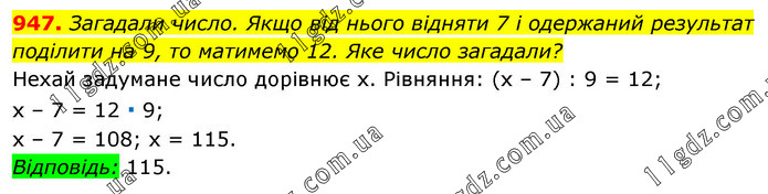 Загадали число. Якщо від нього відняти 7 і одержаний результат поділити на 9, то матимемо 12. Яке число загадали? Нехай задумане число дорівнює х. Рівняння: (х – 7) : 9 = 12; х – 7 = 12 ∙ 9; х – 7 = 108; х = 115. Відповідь: 115.